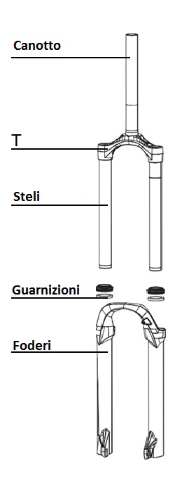Ecco un'immagine degli elementi principali di una forcella da MTB: