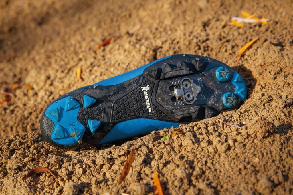 la suola esterna Michelin bi-colore che offre due densità di gomme diverse, sono inoltre abbastanza solide con 23 Shore intorno alle tacchette. A differenza, I ramponi blu posti sotto il tacco e sulla parte anteriore sono più morbidi. Si raggiunge dunque a un buon compromesso che consente alla scarpa di avere