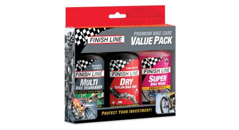Value pack finish line e la 120ml combo perfetta per la pulizia e la manutenzione della bici si compone di un concentrato bike wash da diluire in acqua per la pulizia generale della macchina uno sgrassante multiuso per la vostra catena cassette e altre parti meccaniche e infine un secco lube teflon si lubrificante re ingrassare tutte le parti pulite anticipo questo kit e semplice ed efficace completa